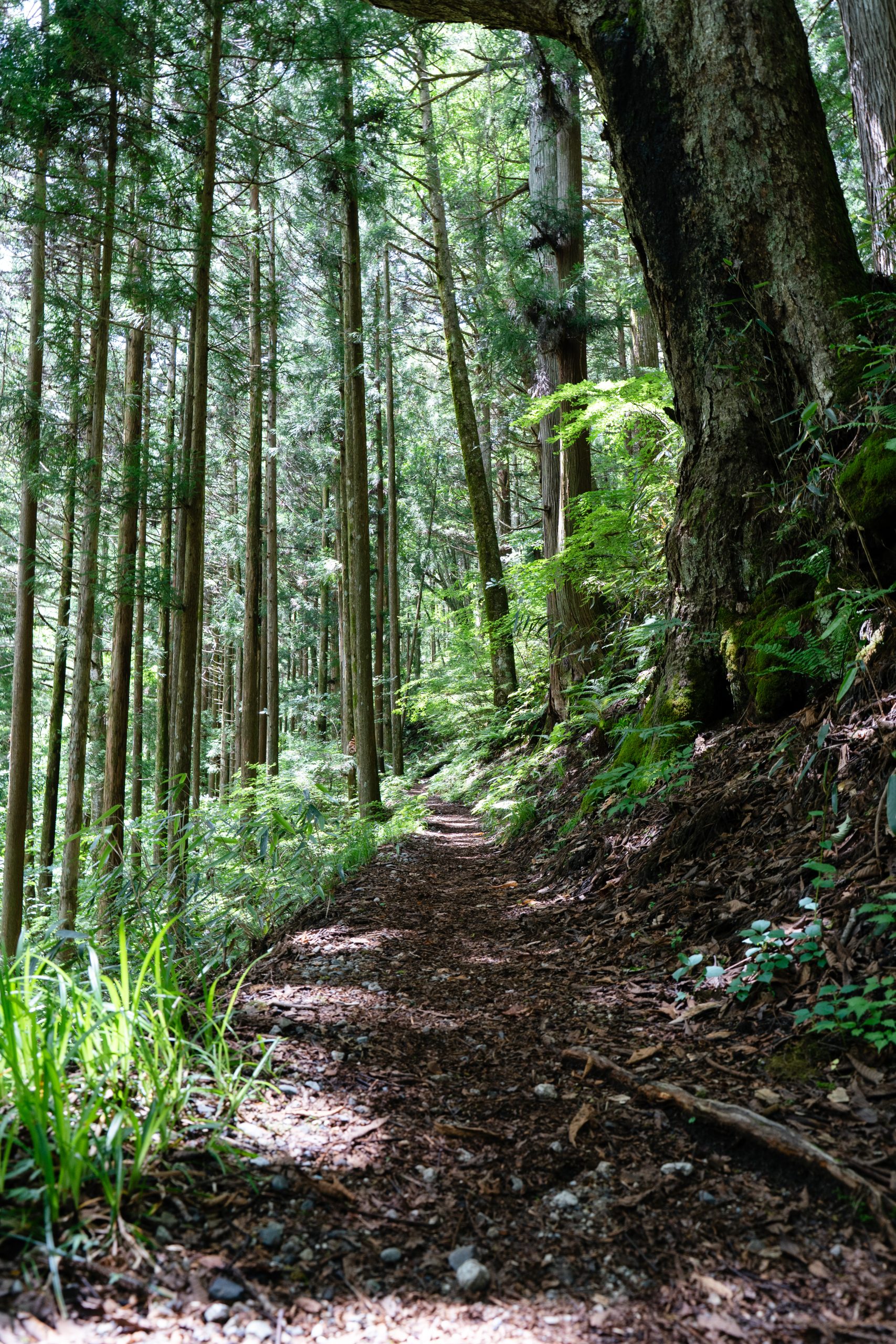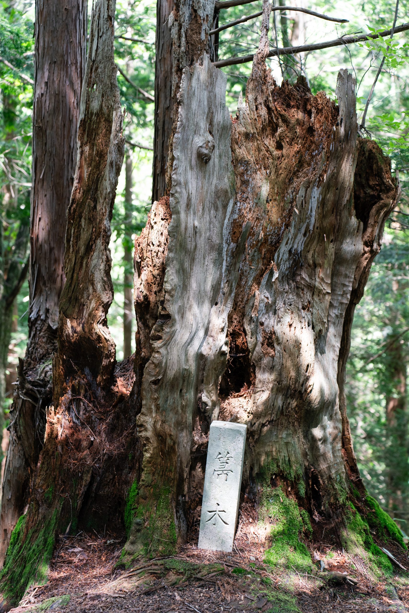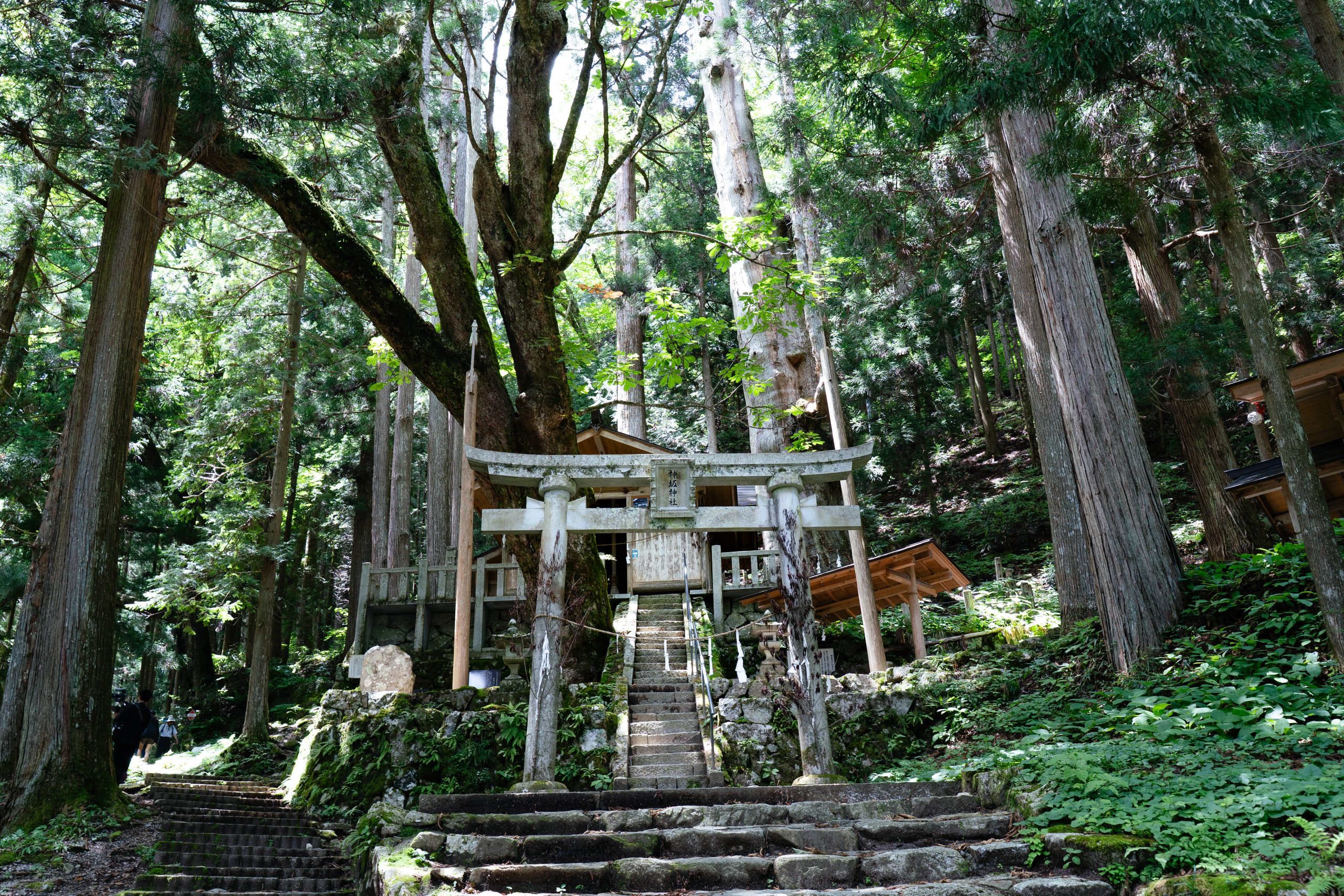 樹齢数百年、なかには2000年にもなるという巨木が林立する山道を進み、最初に訪れたのは、「神坂神社」。