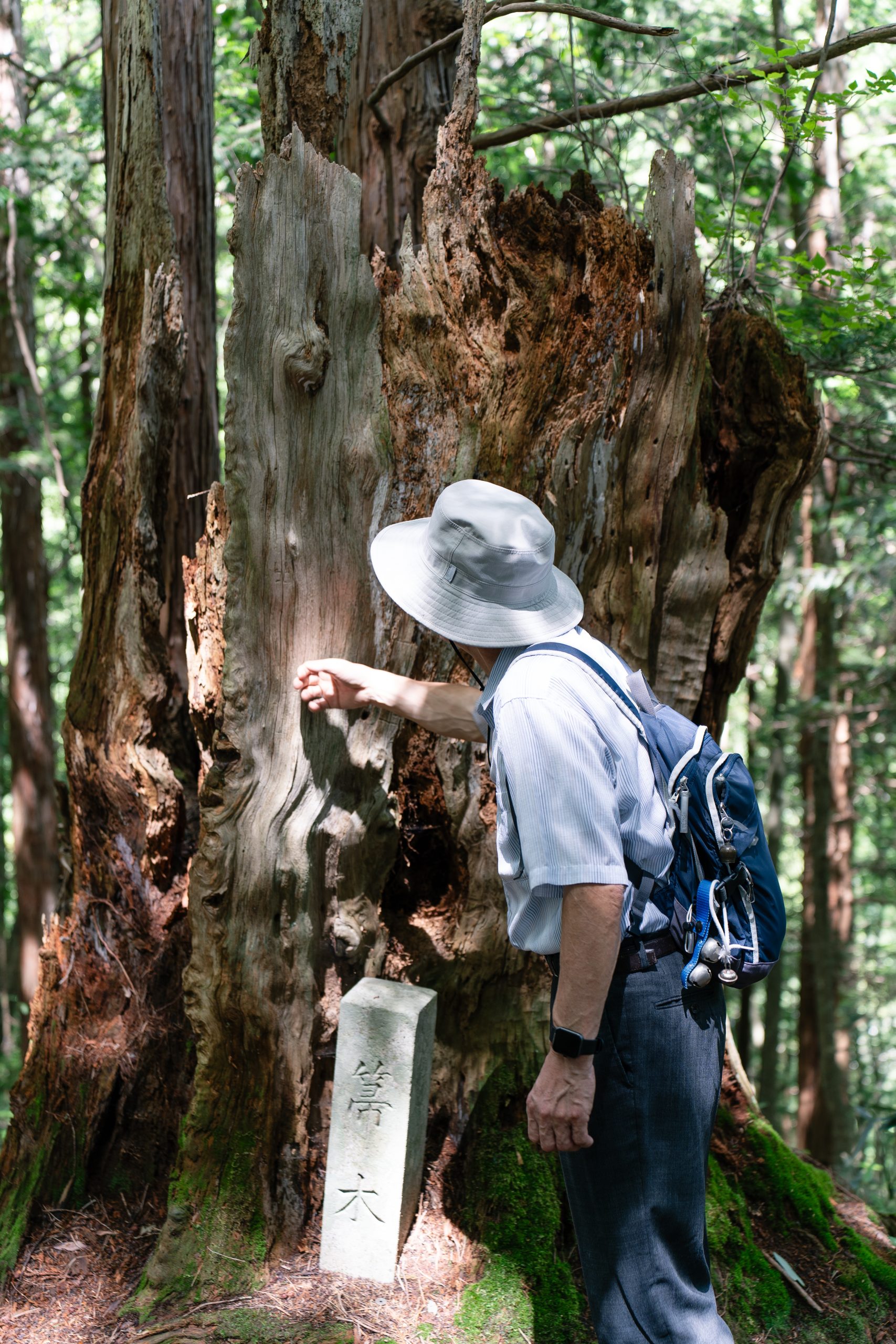「こちらの切り株は「帚木(ははきぎ)」と呼ばれています。源氏物語など読んだことがある人は、もしかしたら聞き覚えのある言葉かもしれません。実は、この帚木は、多くの古典文学に登場する言葉でして、その由来となっているのが、こちらの切り株であると伝えられています。」