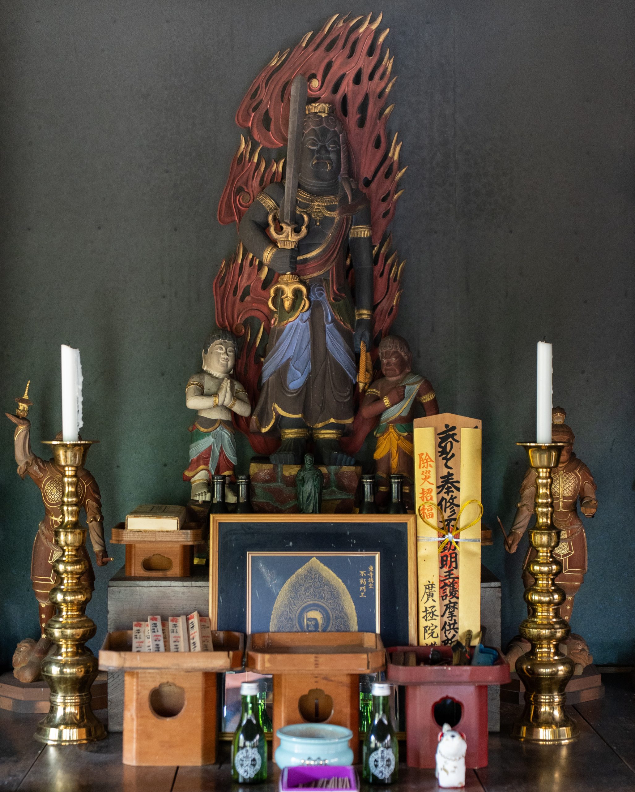 「こちらの月見堂は、現在、護摩堂として使用しています。中央には不動明王さま、脇には子宝地蔵菩薩さまをおまつりし、毎月28日にお護摩を焚いております。今までおまつりしていた薬師如来さまは、境内の坐禅堂へお移りいただいています。」