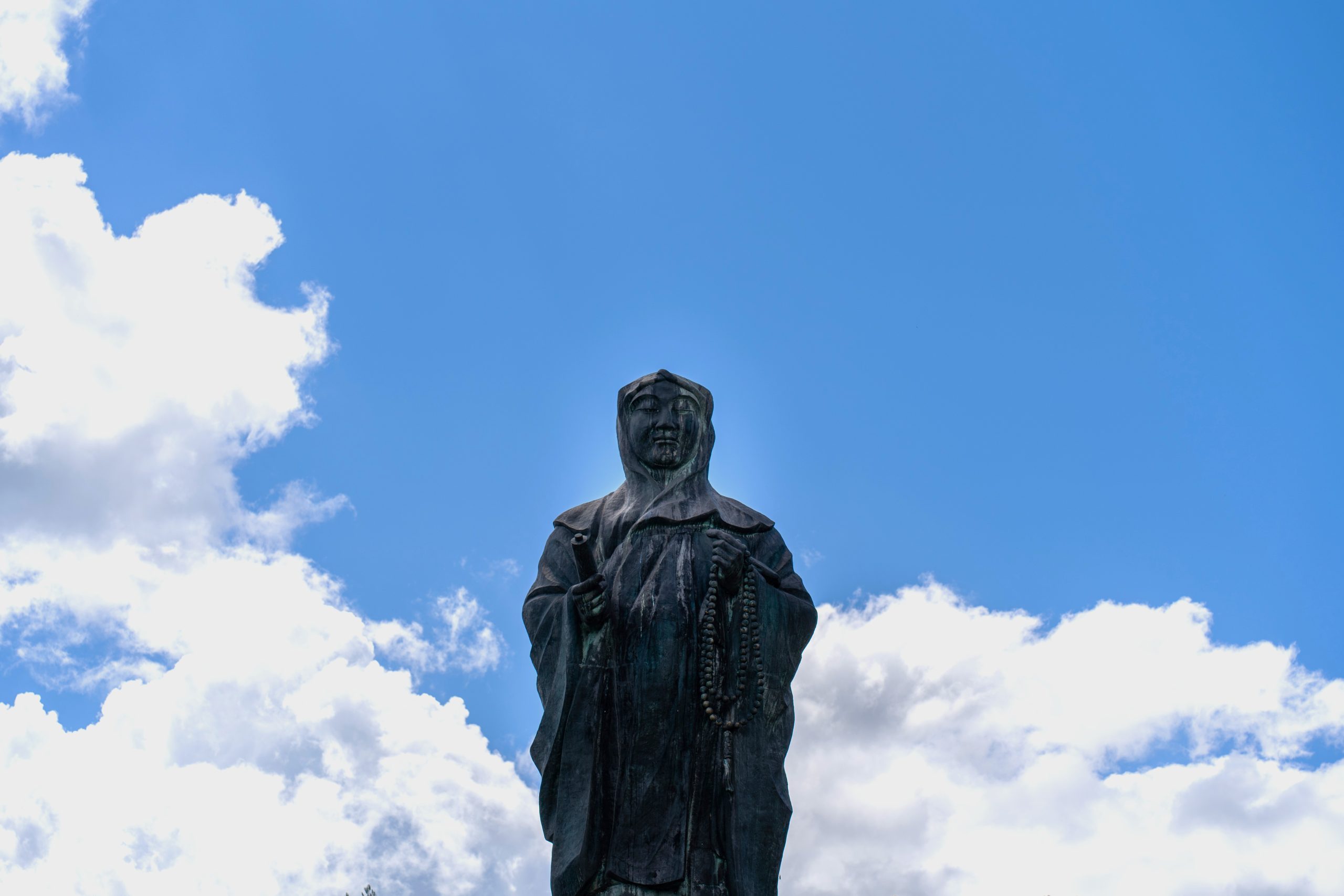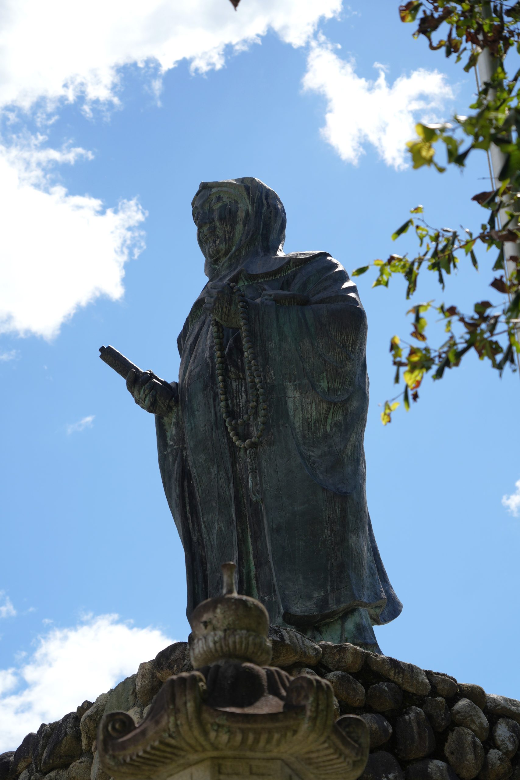 続いてご案内いただいたのが、青空の下に力強く立つ伝教大師像