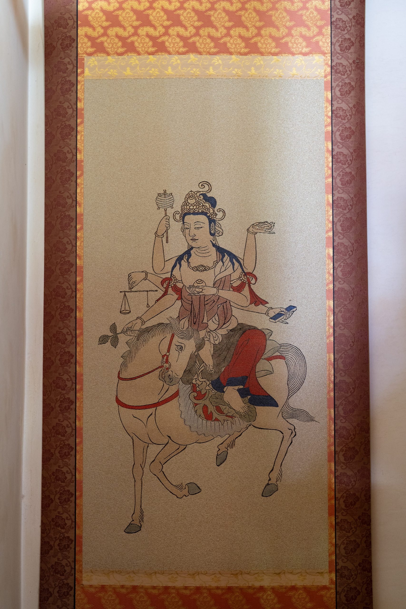 「近年、阿智村の星空が有名になり、星空を楽しむ皆さんが阿智村を訪れる機会が多くなりました。ですので、阿智村におまつりしたほうが仏さまも喜ばれるだろうということで、廣拯院にお移りいただいた仏さまになります。妙見菩薩さまは中国で生み出された仏さまであると考えられておりまして、他の如来さまや菩薩さまとは異なる服装や、明王さまかと思えるような憤怒の表情も特徴です。」