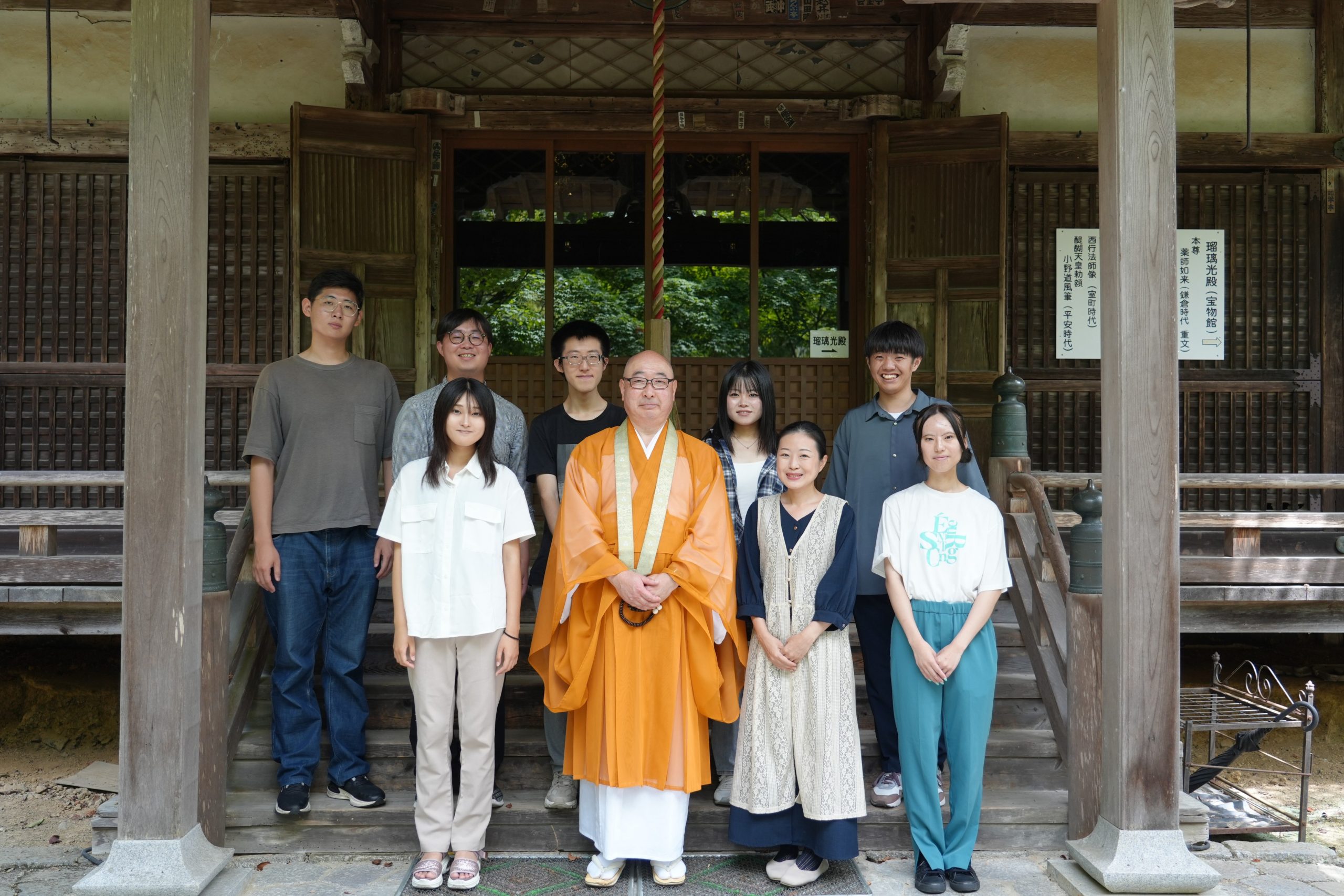 清浄な空気に包まれるお薬師さまの浄土でゆったりとご住職と語らう学生たちでした。