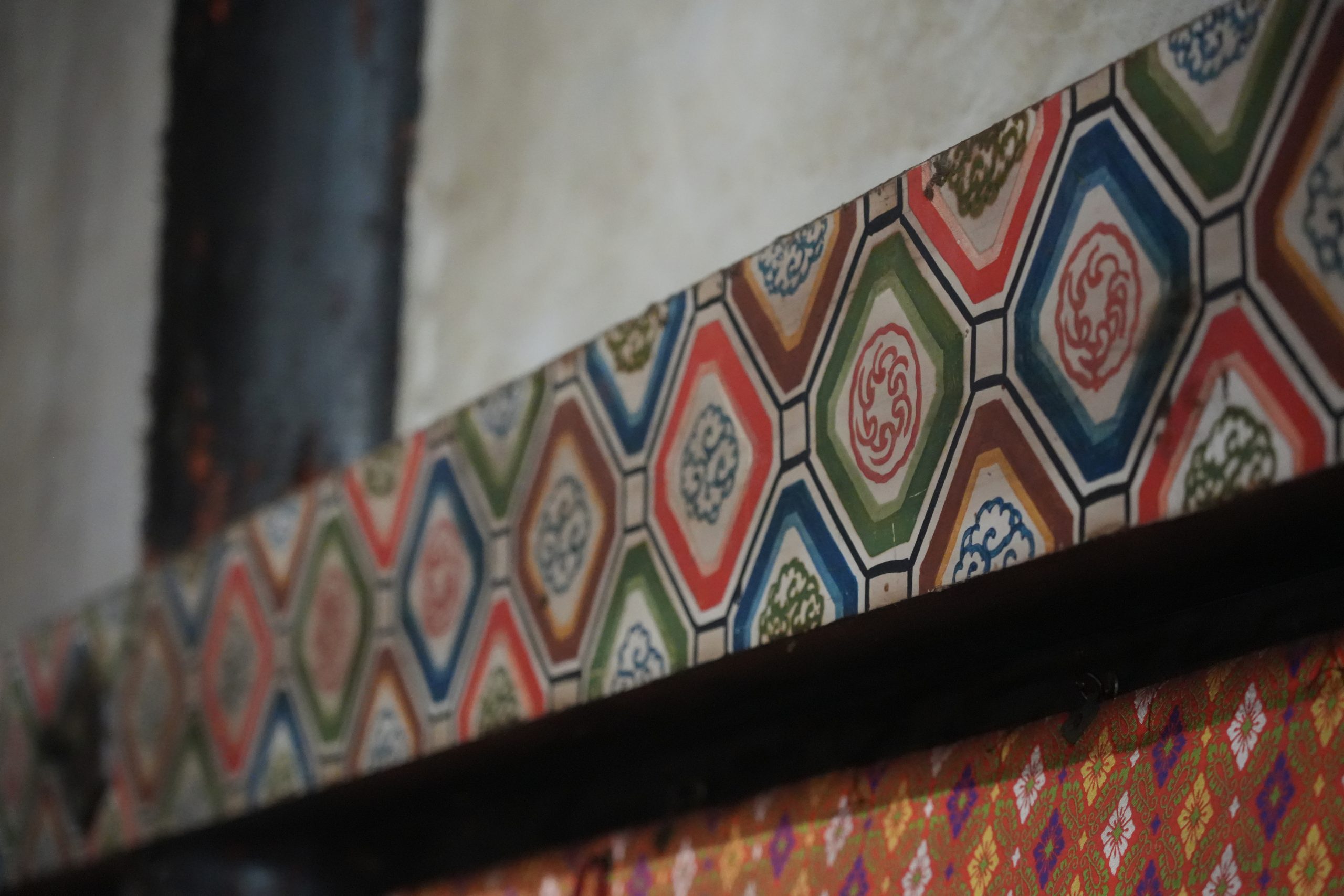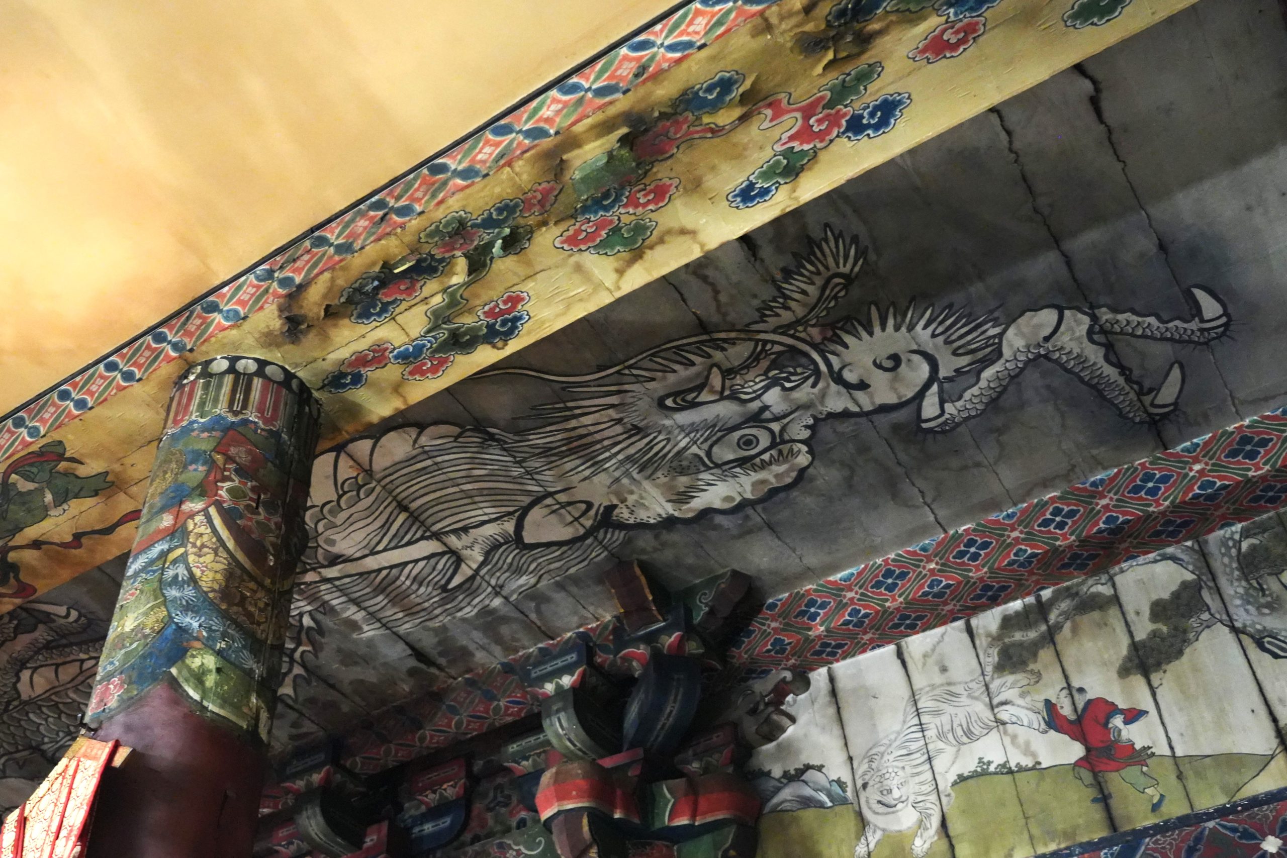 「天井や壁面をご覧いただくと、龍が3体描かれていますね。龍は水をつかさどる神様であり、おまつりするとお寺や建物を火災から守ってくださるそうです。この龍や他の壁画も秀頼公によって松尾寺にこの建物が移築された際に描かれたものですので、この建物を火災から守ってほしいという願いが込められているのだと思っています。これらの極彩色の美しく迫力ある壁画は、私の知る限り一回も修復をしたことがないです。約400年前に描かれた絵が現在まで変わらず伝えられていることの凄さを感じ取っていただけたらなと思います。」