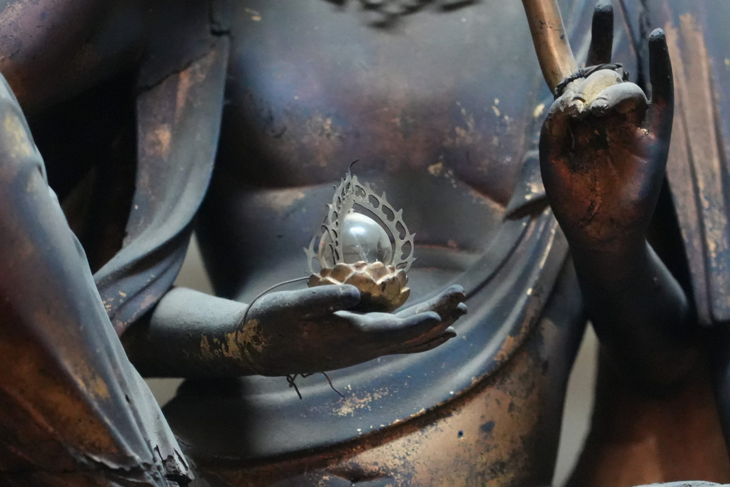 「それでは何を考えているのか、その答えは如意輪観音様の腕の部分にヒントがあります。皆さんが仏様の姿を思い浮かべると、私たちと同じように、2本の腕を持つ姿を想像すると思います。しかしながら、如意輪観音様の腕は2本ではないですね。数えていくと6本の腕があります。この腕の本数にも意味がありまして、仏教で説かれている6つの世界(六道:天道・人間道・修羅道・畜生道・餓鬼道・地獄道)に生きるすべての衆生を救うということを表しています。」