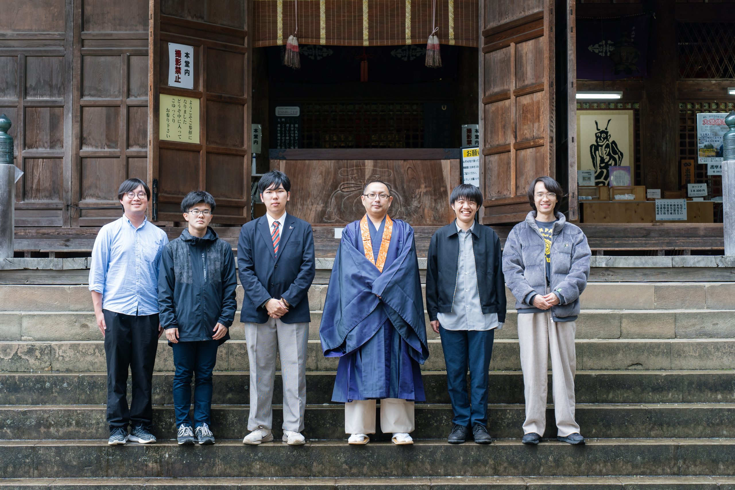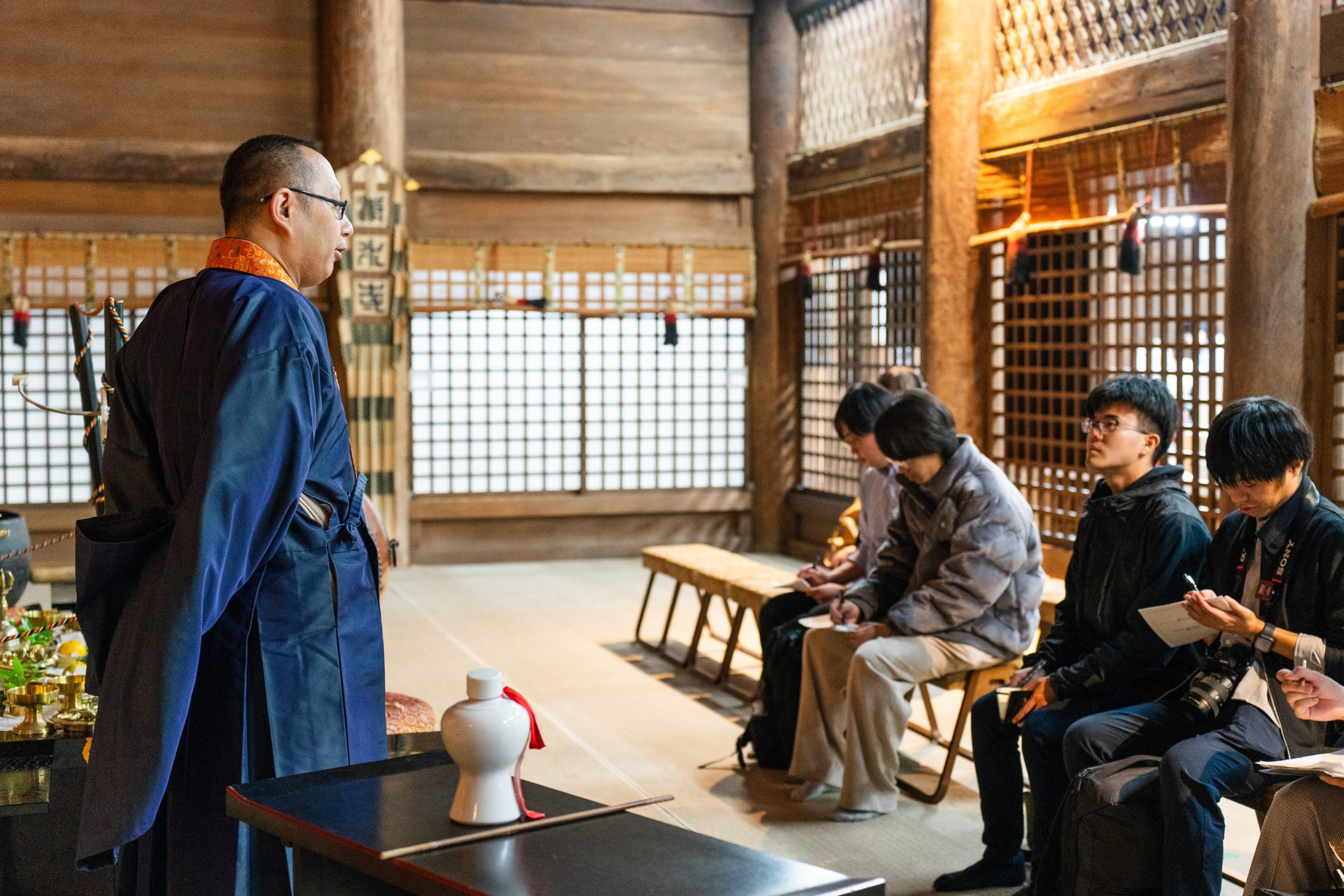 根本堂へ到着すると、清水谷師が学生たちを出迎えました。
