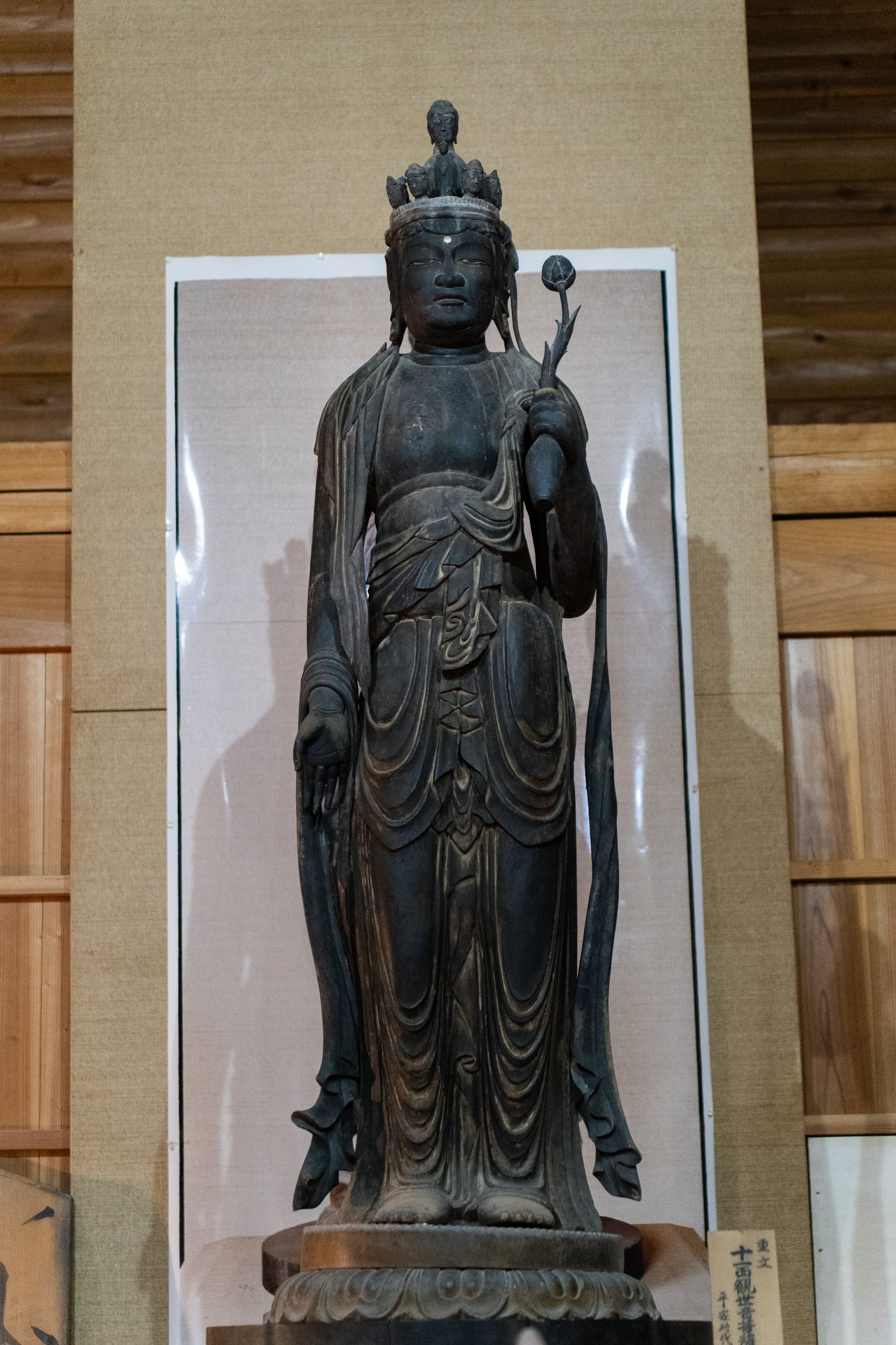 「宝物館におまつりされている十一面観音様は、平安時代の10世紀までに造立された仏様であると考えられており、国の重要文化財に指定されています。実は、もともとこちらの十一面観音様が秘仏の御本尊様としておまつりされており、現在の四臂十一面観音様は、井戸のある後陣に背中合わせでおまつりされる『裏観音』としてまつられていました。」