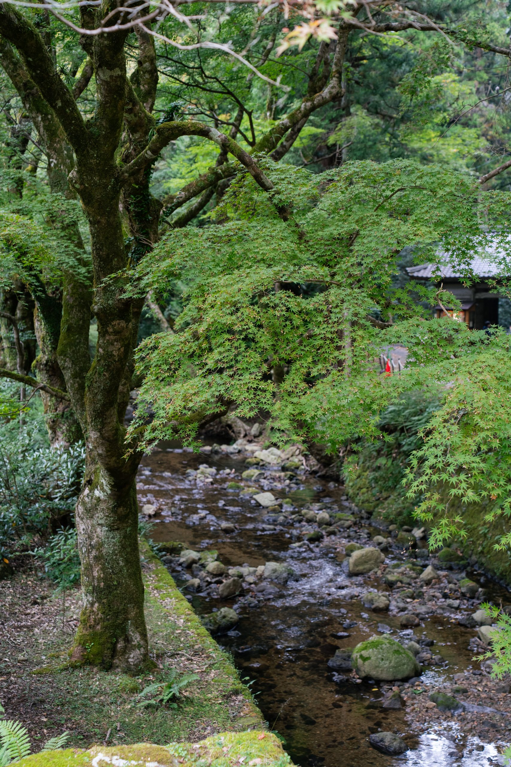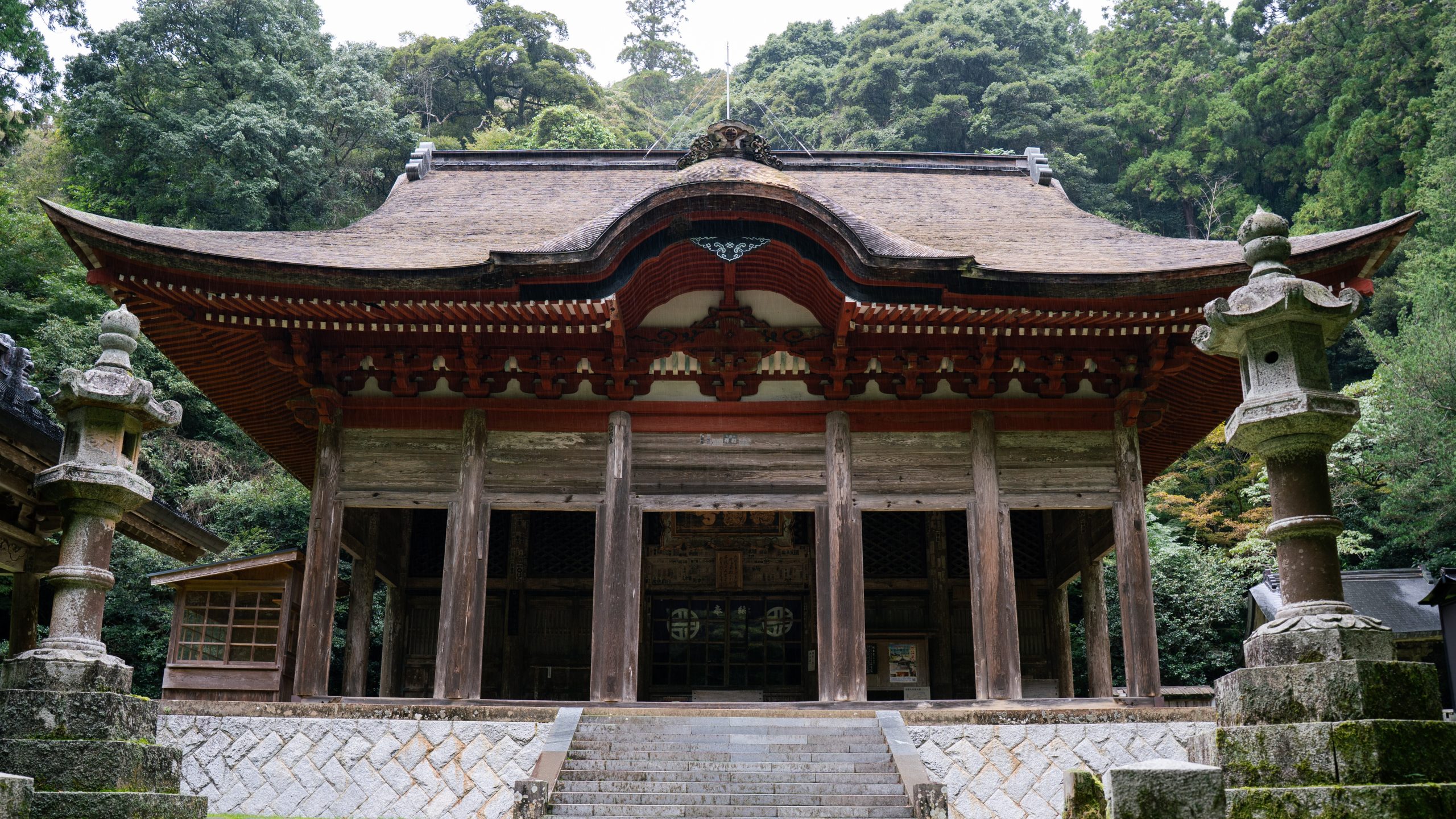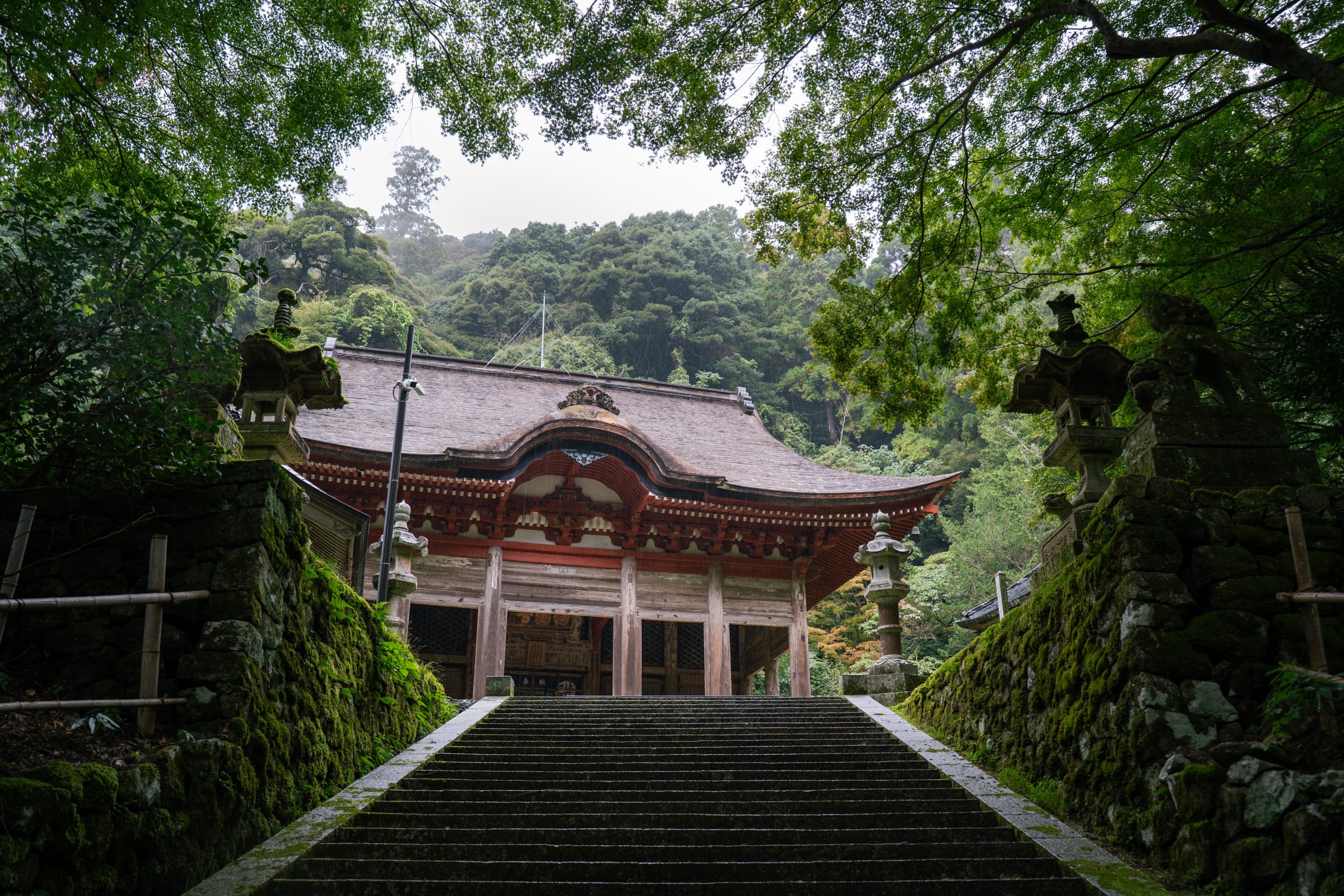 足元には深い緑色の苔が育まれ、頭上をモミジの葉々が覆う石段を進んでいくと、屋根が立ち上がるように反る大きなお堂が姿をあらわしました。