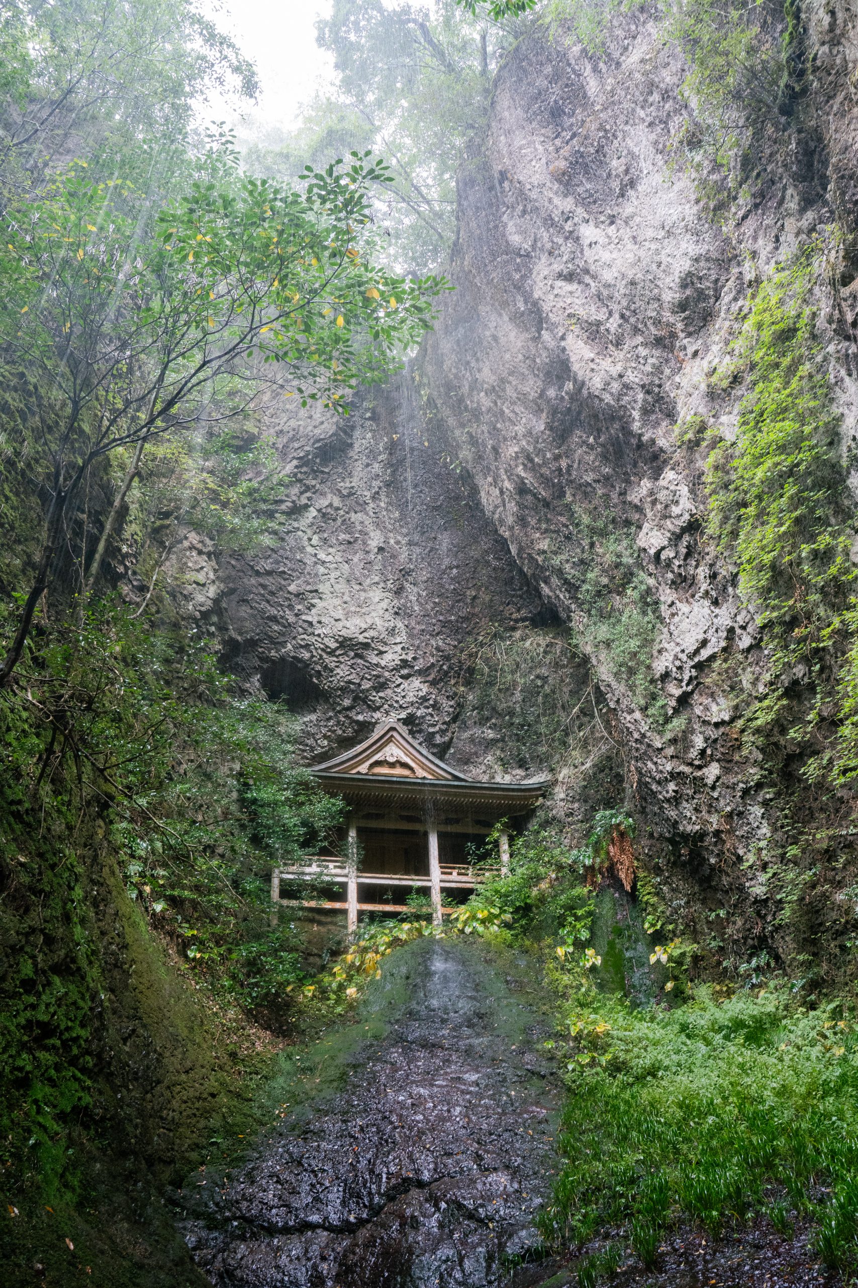 雨足もしだいに強くなり、足元を濡らしながら歩みを進めること約10分、滝の音が聞こえてきました。