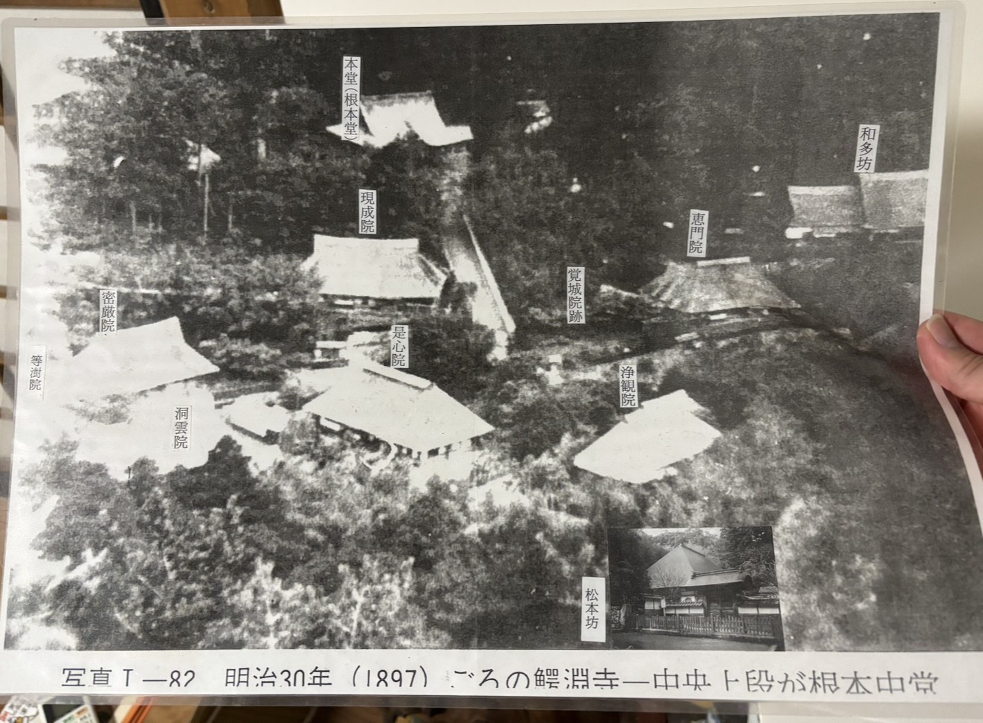 「先ほどお話ししたように、鰐淵寺には大きな境内があります。以前はこの大きな境内の中に、僧房というお寺が軒を並べていました。こちらの白黒の写真は、明治時代に撮影された鰐淵寺の境内の様子です。根本堂の周りにいくつか建物が見えると思いますが、こちらが僧房になります。現在は跡が残るのみですが、往時の鰐淵寺の境内には、このような僧房が軒を連ねていたそうです。」
