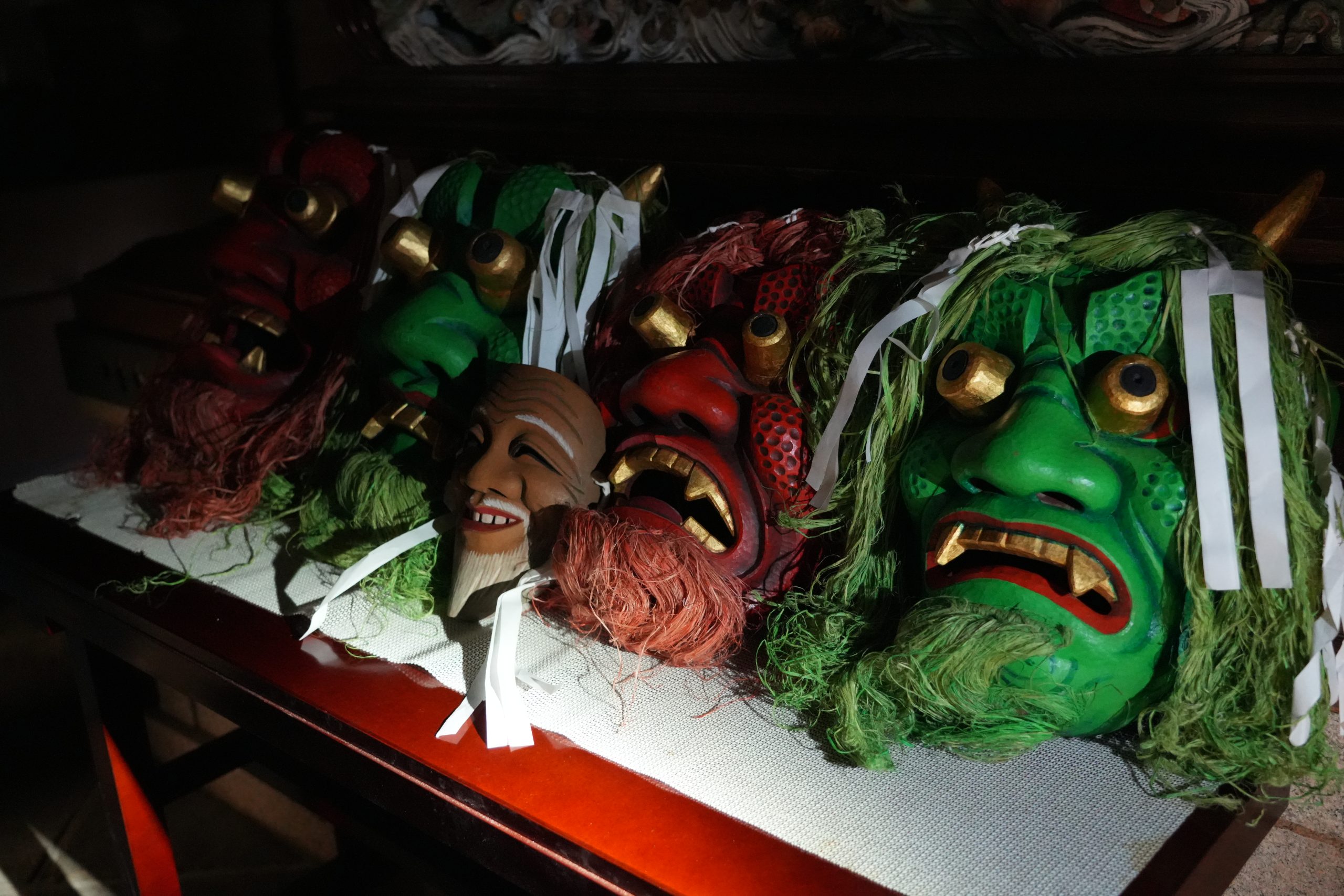 「こちらのお面は毎年2月11日に行われる『鬼こそ』という行事で使用されるお面です。現在使用しているお面は3代目で、お寺に伝えられている最も古いお面が室町時代に作られたお面であると言われています。ですので、少なくとも約600年の歴史のある行事です。」