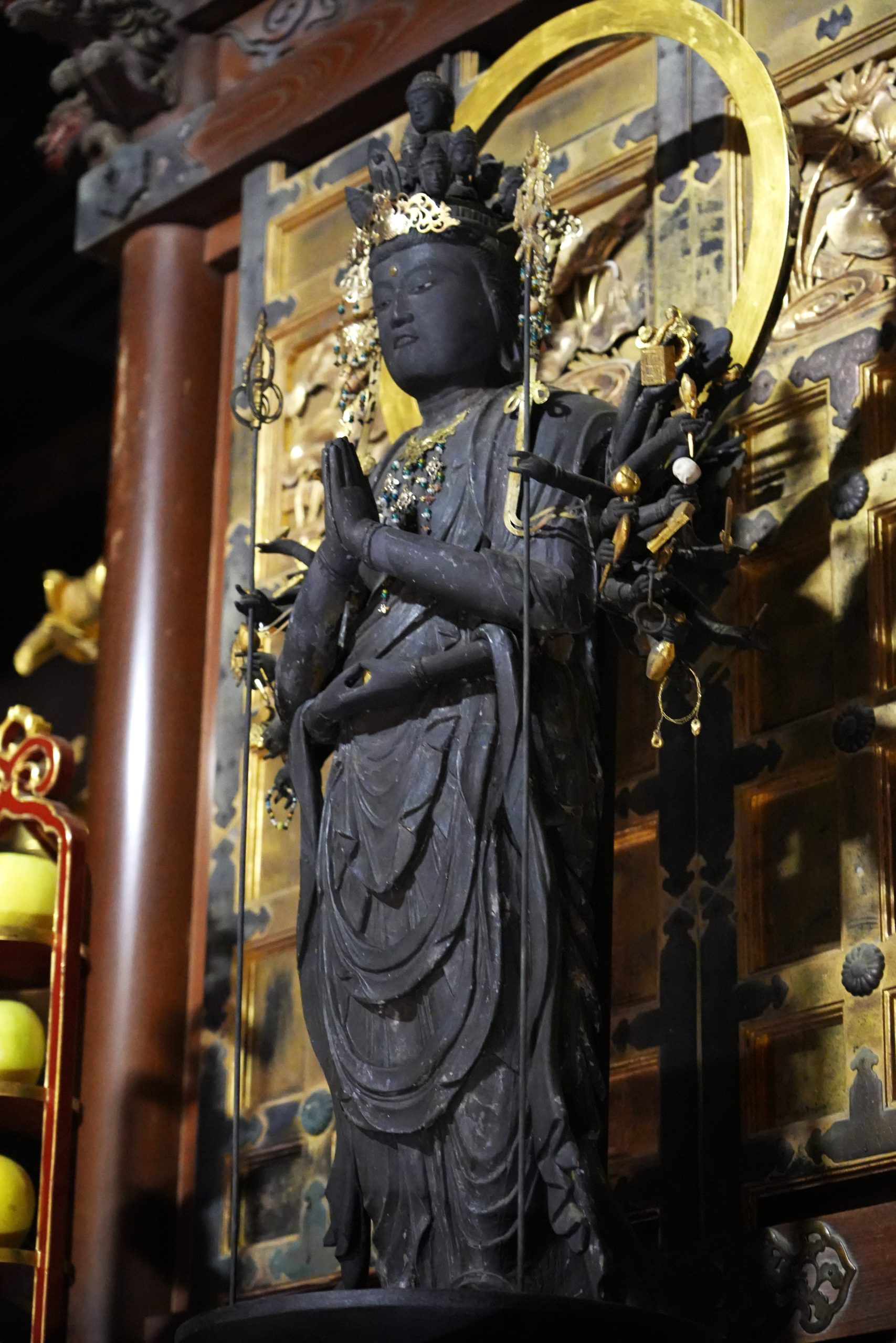「木造ではなく銅造の珍しい仏様でして、寄木造の仏像と同様に、腕と身体とを別々に鋳造して組み合わせるという技法で造立されています。伝えられているところによると、常勝寺を創建した法道仙人の護念持仏を頸に鋳込んで造立されているそうです。平安時代から鎌倉時代にかけて造立された銅造の千手観音菩薩様は全国的に見ても珍しいそうで、国の重要文化財に指定されています。」