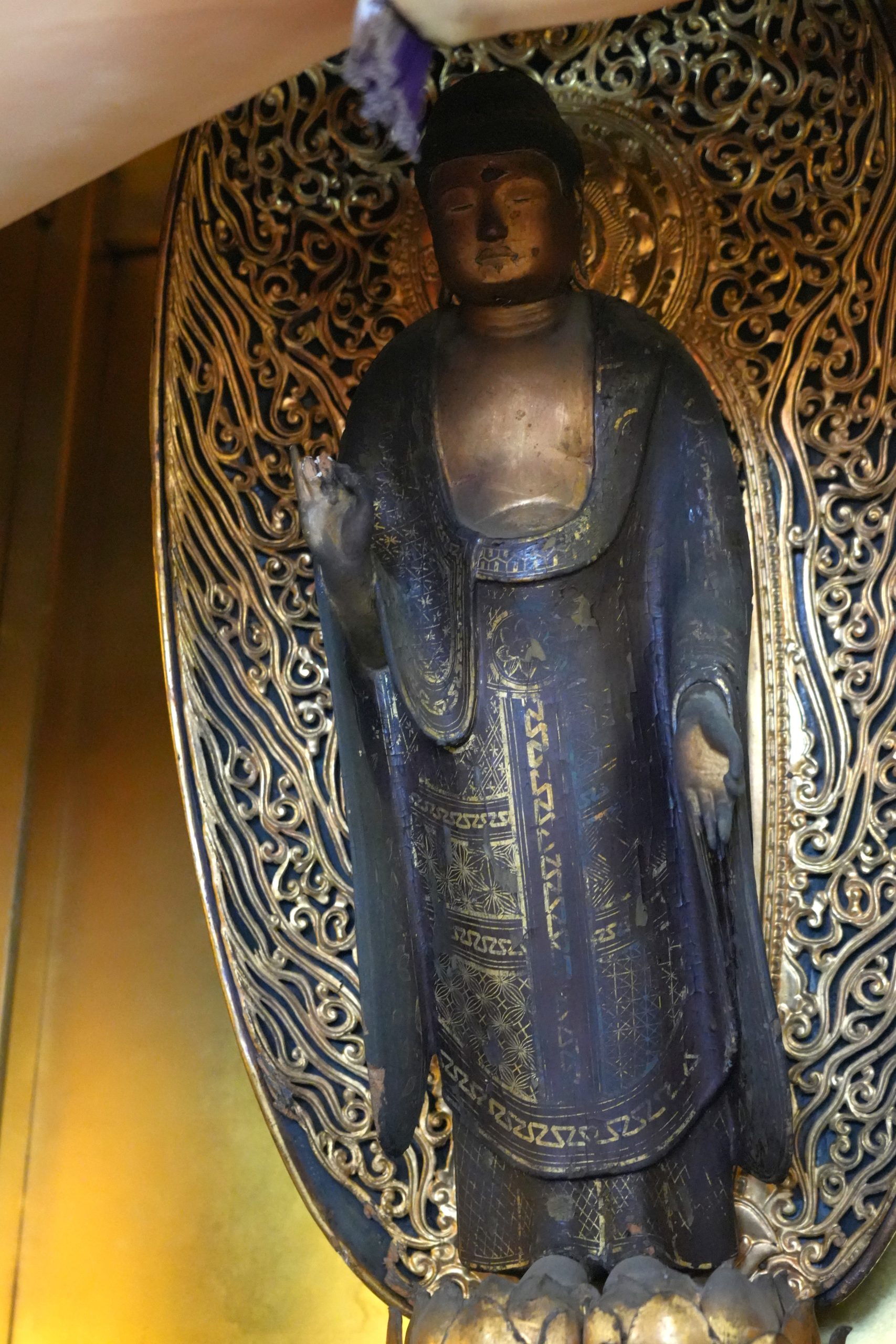 井上師のご厚意により幕を上げていただくと、そこには金色に輝く精緻な文様が施された衣をまとう穏やかな阿弥陀如来様がいらっしゃいました。